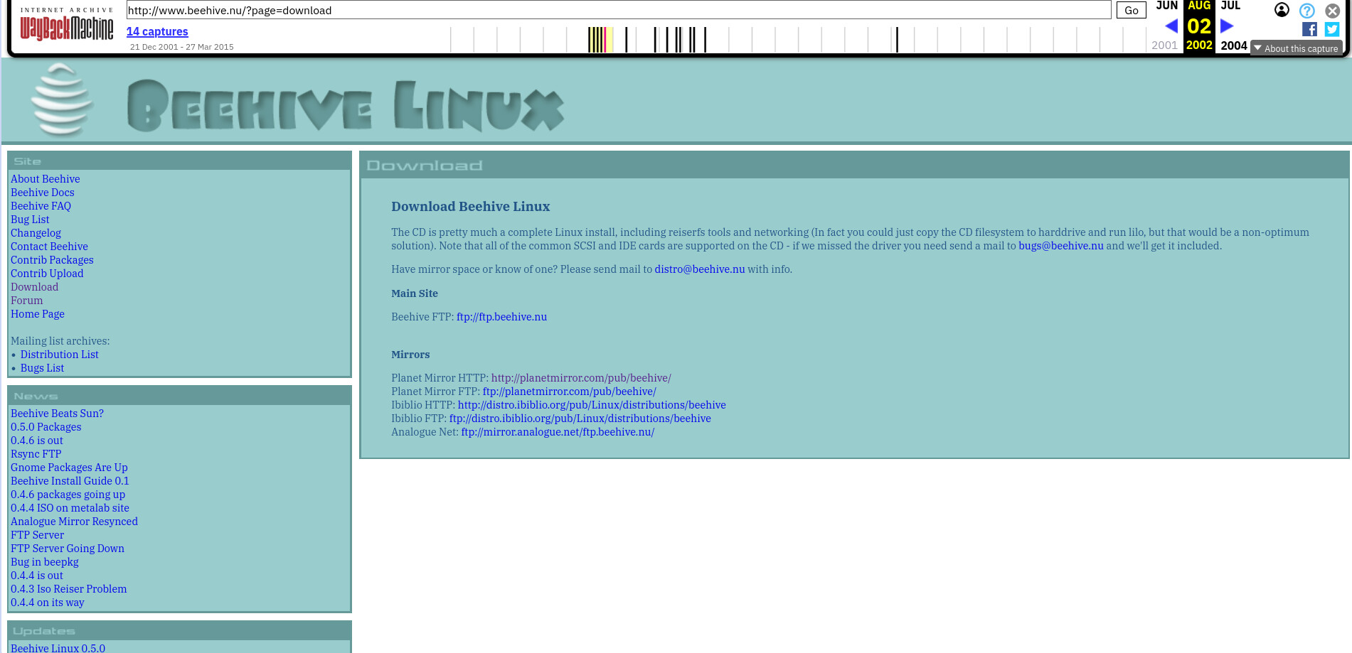 Hello, I’m a contributor in the all things linux (.gg/linux) iso archival project, and me and a couple other people were losing our mind on this distro called beehive linux, as you can see from the image i uploaded, ibiblio hosted a mirror with beehivelinux on it, right now its not there, does anyone have it? If so, please contact me on discord or via email.